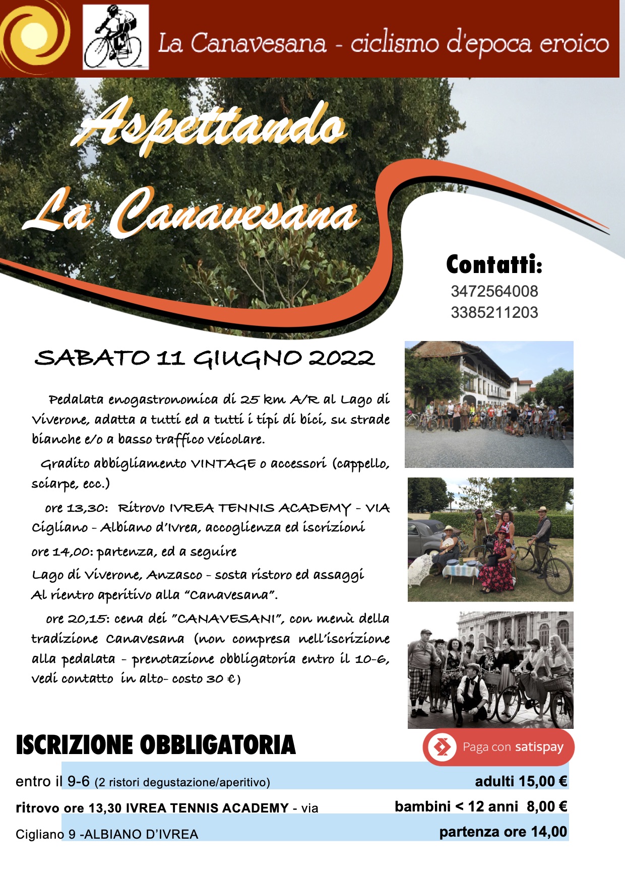 Il sabato pomeriggio dalle 13,30 si terrà una PEDALATA ENOGASTRONOMICA VINTAGE per tutti e per tutti i tipi di bici (gradita una pre-iscrizione) ed alle 21,00 CENA DEI CANAVESANI, con prenotazione obbligatoria (in tempo utile)