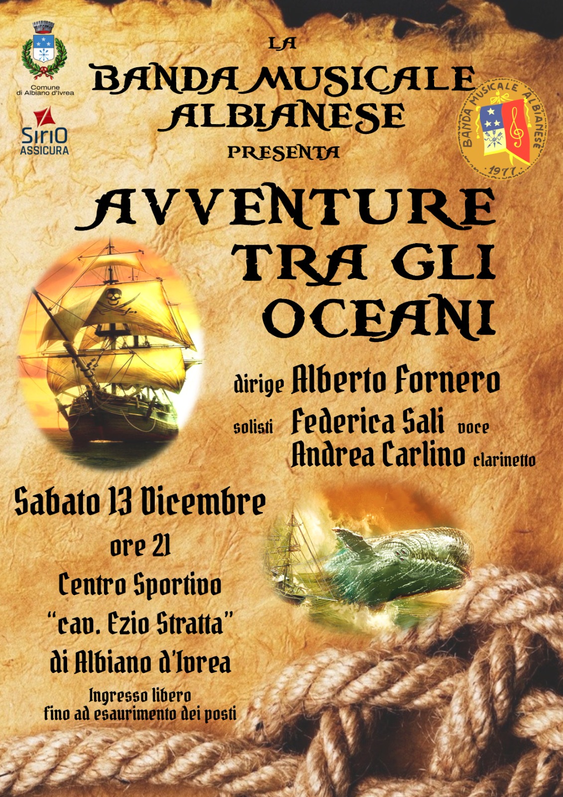 La Banda Musicale Albianese festeggia Santa Cecilia (Patrona della musica, dei musicisti e delle musiciste) e presenta Sabato 13 dicembre 2025 -ore 21,00- il concerto “Avventure tra gli Oceani".