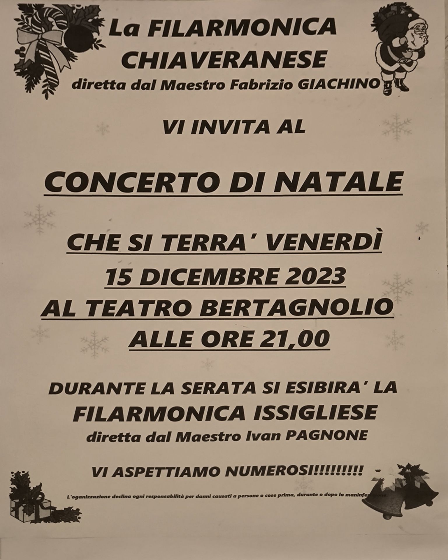 Venerdì 15 dicembre alle ore 21, al Teatro Bertagnolio, è in programma il Concerto di Natale della Filarmonica Chiaveranese diretta dal Maestro Fabrizio Giachino e della Filarmonica Issigliese diretta dal maestro Ivan Pagnone.