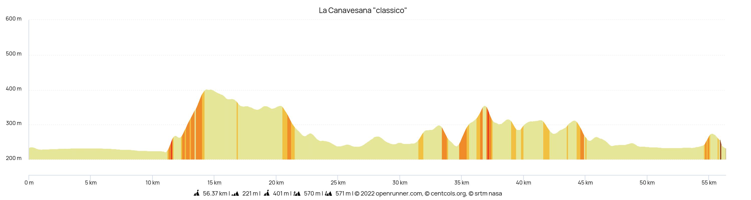 60 km circa - 570 mt D+, da percorrrere in gruppo ad andatura controllata - 1 strada delle carrozze (unica nel suo genere, sempre chiusa al transito, aperta solo per La Canavesana porta al Castello di Masino con 22 tornanti) - 5 settori sterrati su strada bianca dedicati ai nostri Campioni- 3 ristori