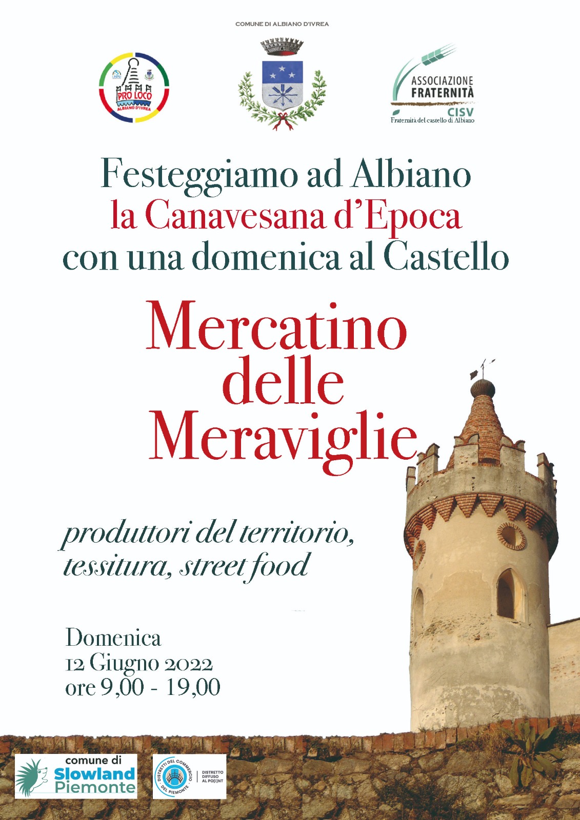 - nel vigneto del CASTELLO saranno posizionate bancarelle del MERCATO DELLE MERAVIGLIE con prodotti locali, tessitura, street food ecc, nel parco del Castello sarà posizionato il pasta party;