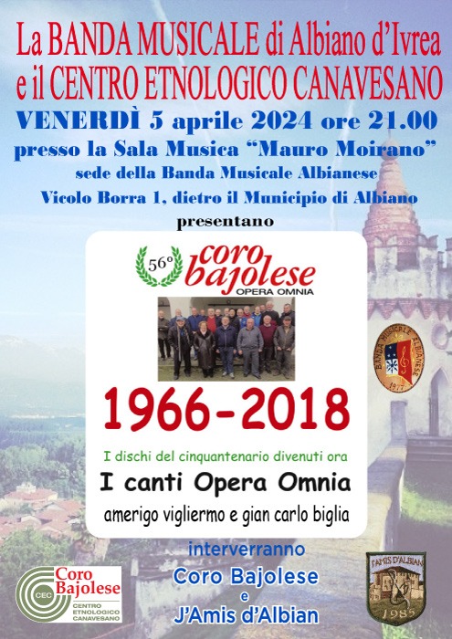 La BANDA MUSICALE di Albiano d'Ivrea ed il CENTRO ETNOLOGICO CANAVESANO presentano VENERDi 5 aprile 2024 ore 21.00 (presso la Sala Musica "Mauro Moirano", sede della Banda Musicale Albianese, Vicolo Borra 1) i canti OPERA OMNIA 1966-2018 (dischi del cinquantenario divenuti ora i canti Opera Omnia).